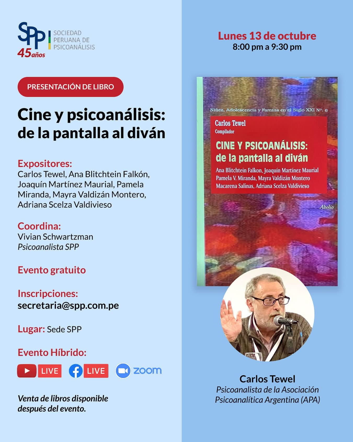 Estimados colegas, La Comisión de Comunidad y Cultura y el grupo Cine y Psicoanálisis de la SPP les invitan a la presentación del libro “Cine y Psicoanálisis: de la pantalla al diván” (2025, Ediciones Vergara: Buenos Aires).