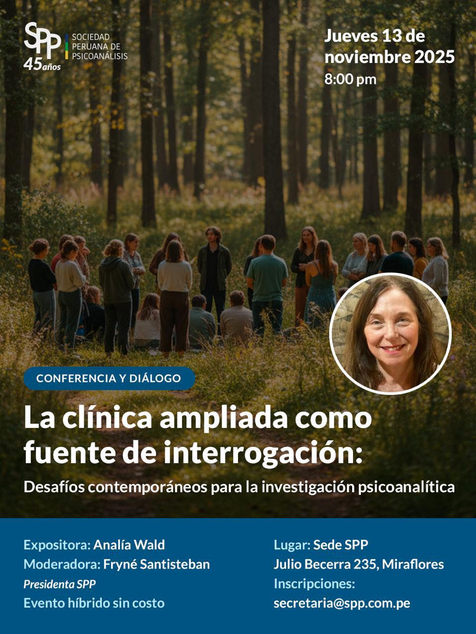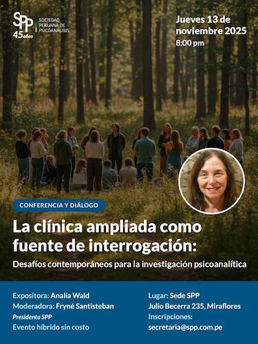 Hemos invitado a Analía Wald, colega de la Asociación Argentina de Psicoanálisis, APA, a ofrecernos la conferencia La clínica ampliada como fuente de interrogación: desafíos contemporáneos para la investigación psicoanalítica para abrir un diálogo, que esperamos sea estimulante, no sólo para quienes tenemos práctica fuera el consultorio sino también para todos los que estamos atentos al futuro del psicoanálisis.