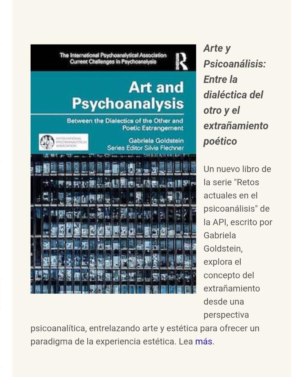 En respuesta a este período de polarización política radical, Gabriela Goldstein ofrece una exploración de la experiencia estética como un evento transformador; un encuentro inesperado con obras de arte que puede conducir a un estado de extrañamiento poético, promoviendo una posible reorganización de la economía psíquica del sujeto. Compartirá diapositivas y viñetas que demuestran la experiencia de este estado de extrañamiento, reflexionando sobre el encuentro entre el sujeto y el otro/Otro, entre analista y paciente, y en el marco que ofrece la situación analítica. En su nuevo libro, Arte y Psicoanálisis: Entre la Dialéctica del Otro y el Extranjerío Poético (Routledge, 2026), analiza cómo la metapsicología de la experiencia estética y su investigación contribuyen a la comprensión clínica de los procesos de simbolización deficiente.