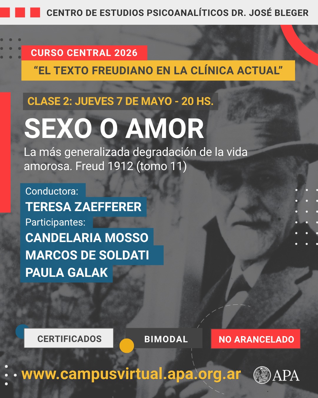 Cursada bimodal: Presencial en el auditorio MOM de la APA y online por Zoom (se envía acceso online a los primeros 100 inscriptos) y simultáneamente se trasmite en vivo por YouTube de la APA.
