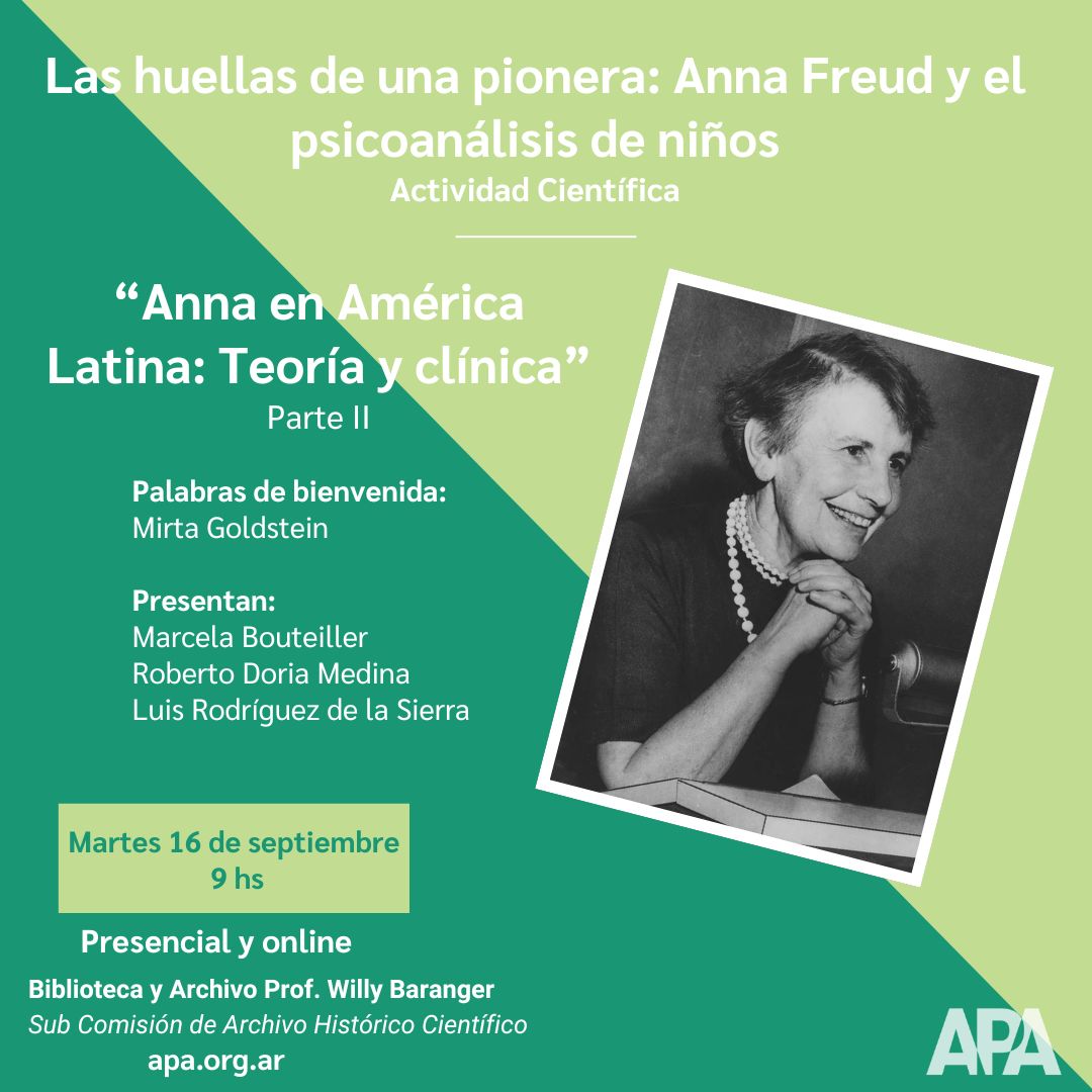 Parte II: "Anna en América Latina: Teoría y clínica ". Palabras de bienvenida: Mirta Goldstein (presidente APA). Presentan: Marcela Bouteiller (Secretaria Comisión Biblioteca y Archivo "Prof. Willy Baranger" APA), Roberto Doria Medina (aportes de la historia de Anna Freud en Latinoamérica), Luis Rodríguez de la Sierra (teoría clínica contemporánea, Sociedad Picoanalítica Británica). 16 de septiembre de 2025. 9 hs (hora Argentina). Actividad presencial y online.